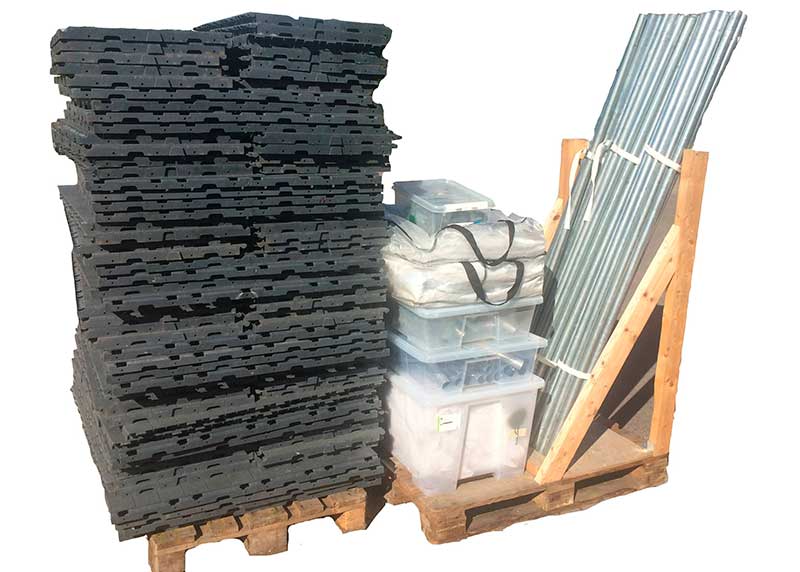 På billedet ses et telt på 5x10 meter med tilhørende 50 m2 gulv til telt. Telte på 5x8 meter fylder cirka det samme. 1m2 teltgulv vejer lidt under 6 kg og er opdelt i stykker på 0,5 x 1,0 meter. Stængerne til teltet er 200 cm lange. Derudover medfølger til teltet den store kasse på 130 liter, de to små kasser på 55 liter, samt to poser med diverse sider og gavle og en lille kasse med yderligere udstyr. Gulvet på pallen på billedet er cirka 110x110 cm. i bredden og er omkring 180 cm. høj. Den kan selvfølgelig deles når bilen/traileren skal pakkes. ![]() |